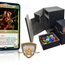 Ihr erhaltet eine Premium Deck Box und Kartenhüllen (100x Card Sleeves) in matt inkl. 2x D20 Würfel (Lebenspunktezähler)