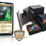 Ihr erhaltet eine Premium Deck Box und Kartenhüllen (100x Card Sleeves) in matt inkl. 2x D20 Würfel (Lebenspunktezähler)